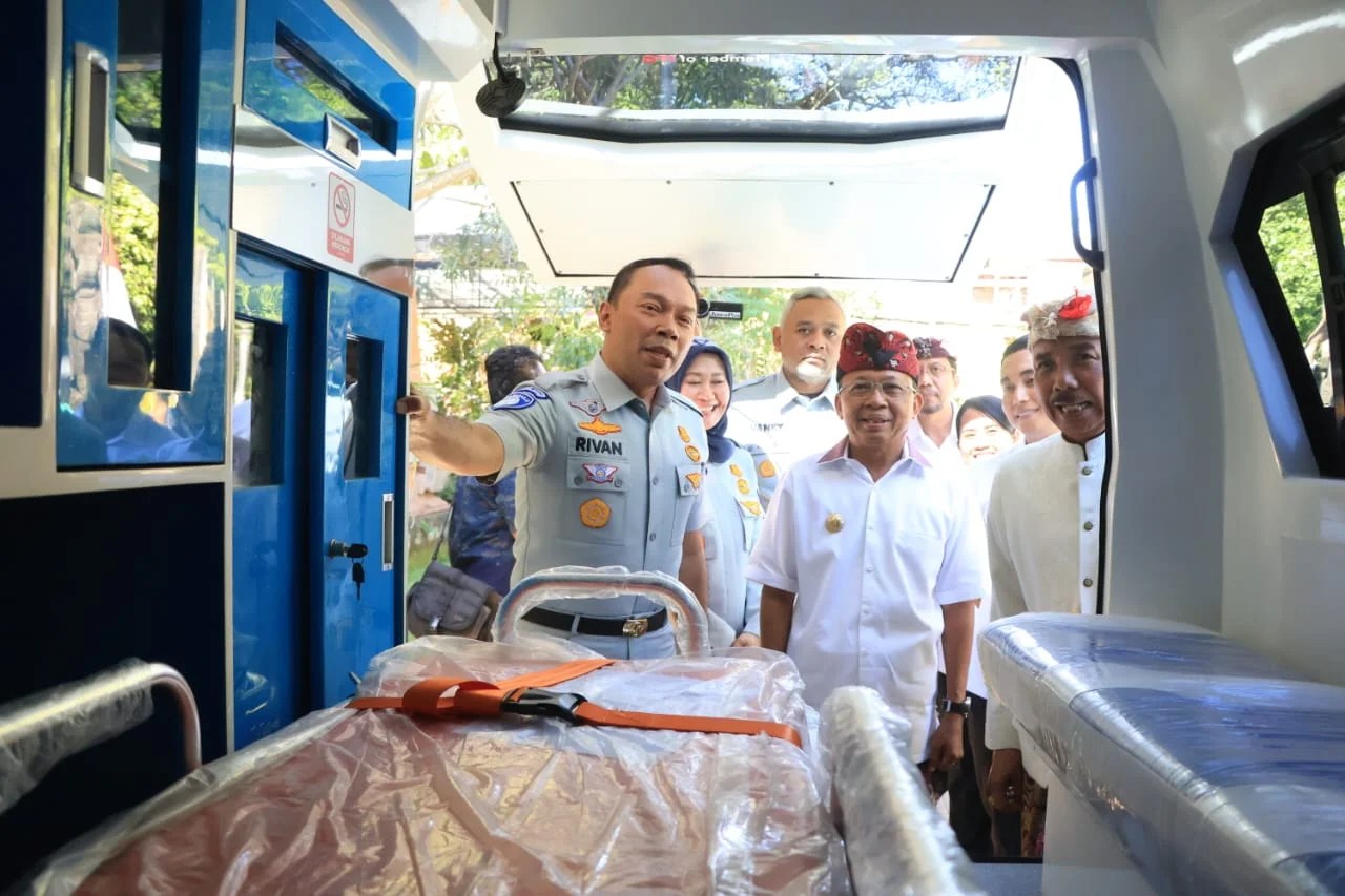 Didampingi Direktur Utama PT. Jasa Raharja, Rivan Achmad Purwantono, Murdaning Jagat Bali, Wayan Koster menyerahkan mobil ambulance kepada MDA Provinsi Bali yang diterima langsung oleh Bendesa Agung MDA Provinsi Bali, Ida Pangelingsir Agung Putra Sukahet.