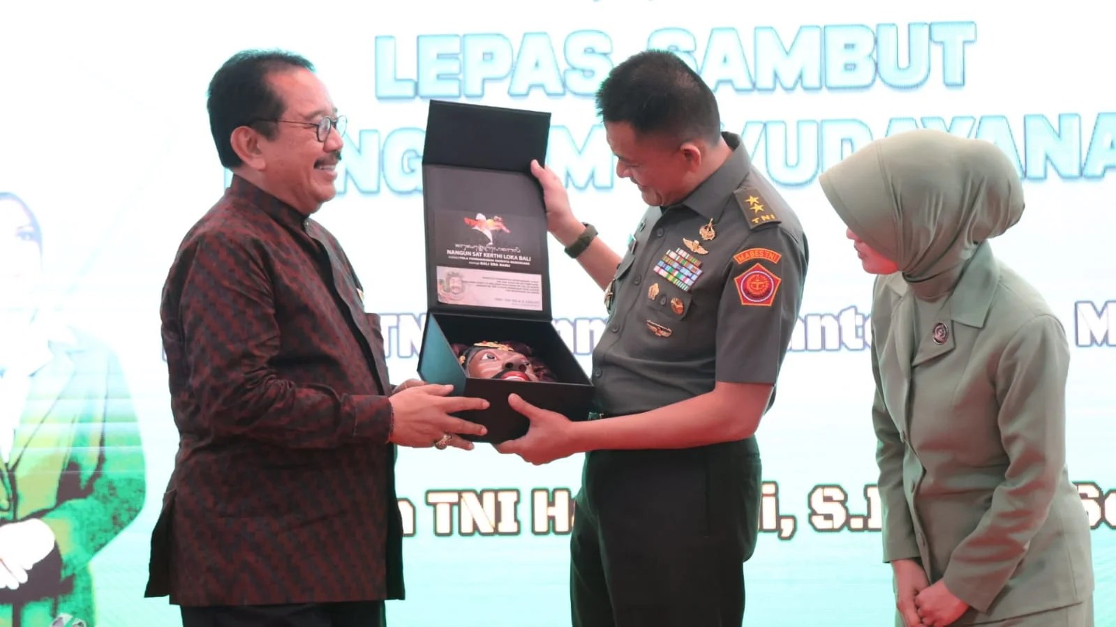 Secara khusus, Wagub menyerahkan cinderamata berupa Topeng Patih sebagai kenang-kenangan kepada Mayjen Sonny Aprianto. Lebih lanjut, Guru Besar ISI Denpasar itu juga menjelaskan bahwa Topeng Patih karya pengrajin lokal Bali tersebut mempunyai simbol kekuatan dan keteguhan. “Dengan ini saya berharap Mayjen Sonny Aprianto bisa kuat dan teguh membela keadilan dalam tugas kedepan,” imbuhnya.